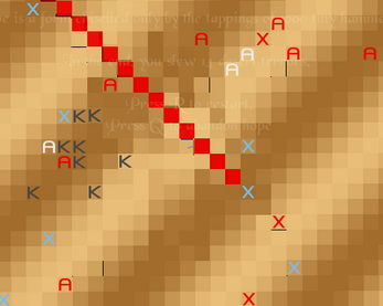Once again, great concept, great execution. As the judges have remarked, it would be very interesting to see a system like this in a more classic environ, but I can see how that would be difficult. Perhaps as a ritualist? Drawing complex designs of chalk sort of thing? It would be nice to be able to fiddle around with techniques in a less chaotic scenario, and I could definitely see potential for an array of randomly generated techniques being scattered around in manuscripts and scrolls. While automatic performance works well here, an alternative would be to have a spell casting mode that the player can activate to perform moves at a cost of an arbitrary unit for each movement, allowing for limited casting and discovery of the aforementioned techniques by trial and error. If absolutely necessary, the whole system could be downsized to a minigame of sorts, allowing the player to stand still. This seems like it would work well for carving/drawing detailed runes on some medium like a scroll (this could be great if you needed more complex combinations) or a single tile, and could even be used in conjunction with a larger scale endeavour.